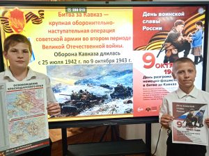 9 октября День воинской славы – День разгрома немецко-фашистских войск в битве за Кавказ. В этот день наши ребята приняли участие в краевой киноакции «Потомки Победителей». Специалисты ЦКД провели с учащимися час патриотизма, в ходе которого напомнили учащимся об основных периодах сражения за Кавказ, после чего продемонстрировали короткометражные фильмы « Город –Герой Новороссийск» и « Когда горит вода». Данное мероприятие позволило учащимся узнать не только о значимости битвы за Кавказ, но и оценить героизм, стойкость и сплоченность русского народа!