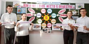 Очередное  занятие  из цикла «Разговоры о важном» на этой неделе было посвящено важной теме — «Как найти свое место в обществе?». Занятия прошли   в форме познавательных бесед  с использованием видеоматериалов и интерактивных элементов.  В ходе занятий  педагоги рассказали ребятам о том, что найти  свое место в обществе – это значит соответствовать его ценностям и традициям, любить то, чем занимаешься и приносить пользу своей стране.  На примере героев  из  фильмов школьники узнали, можно ли стать счастливым, помогая другим людям, о том,  что не сбиться с выбранного пути помогает вера в себя и в свои силы, поддержка  семьи и  друзей.