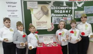 27 января – особая дата в истории нашей страны. 27 января 1944 года была прорвана блокада Ленинграда. Педагогами школы был проведён цикл мероприятий, приуроченный к этой памятной дате. Мы присоединилась к Всероссийской патриотической акции «Блокадный хлеб», которая направлена на то, чтобы напомнить всем о героизме и стойкости жителей блокадного Ленинграда. Школьники вспомнили о том, что символом акции стал небольшой кусочек хлеба весом 125 грамм — именно такой была минимальная норма выдачи хлеба в Ленинграде в самый трудный период блокады — зимой 1941–1942 г. В ходе воспитательных часов педагоги рассказали ребятам о тяжелых испытаниях, выпавших на долю жителей осажденного Ленинграда: о голоде и холоде, о детях и женщинах, работавших наравне с мужчинами на заводах, о защите и обороне Ленинграда советскими солдатами. Особенными чувствами ребята прониклись к судьбе маленькой девочки Тани Савичевой, дневник которой стал одним из символов Великой Отечественной войны. Подвиг людей в блокадном Ленинграде учит нас мужеству, стойкости и безграничной любви к Родине.