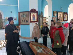Тепло и душевно встретили наших ребят под сводами Свято- Покровского храма иерей Дионисий и помощник благочинного Валентина Александровна Шубина .Они доступно и интересно рассказали детям о том, что храм – это место особого присутствия Бога, о правилах поведения в храме, иконах и о православной вере.