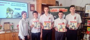 Учащиеся среднего и старшего звена в школьной библиотеке подхватили эстафету Памяти и Славы. Библиотекарь школы Кристина Михайловна Черноусько подготовила для ребят устный журнал «Равнение на подвиг!», посвящённый юным Героям Великой Отечественной войны.