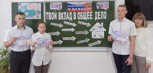 Традиционно рабочая неделя в нашей школе началась с поднятия флага и исполнения гимна РФ. Первым уроком после линейки во всех классах прошли Разговоры о важном по теме «Твой вклад в общее дело».Занятия начались с демонстрации видеоролика с Виталией Корниенко, которая задала тон всем учащимся своим вопрос : « А сегодня? Что для завтра сделал Я? В ходе урока ребята делились собственным опытом участия в общих делах: маленькие шаги по защите окружающей среды, добрые поступки по отношению к другим людям, совместные творческие дела. Ребята приняли участие в деловой игре «Парк», в ходе которой педагоги обратили внимание учащихся на то, что при выполнении задания они смогли прийти к успешному результату только после совместной деятельности. Красной нитью через все занятия прошла мысль о том, что мы живем в одной стране, и будущее каждого из нас так же, как и будущее всей страны, зависит от наших общих усилий. Когда мы работаем вместе, поддерживаем друг друга и стремимся к общим целям — результат не заставит себя долго ждать!